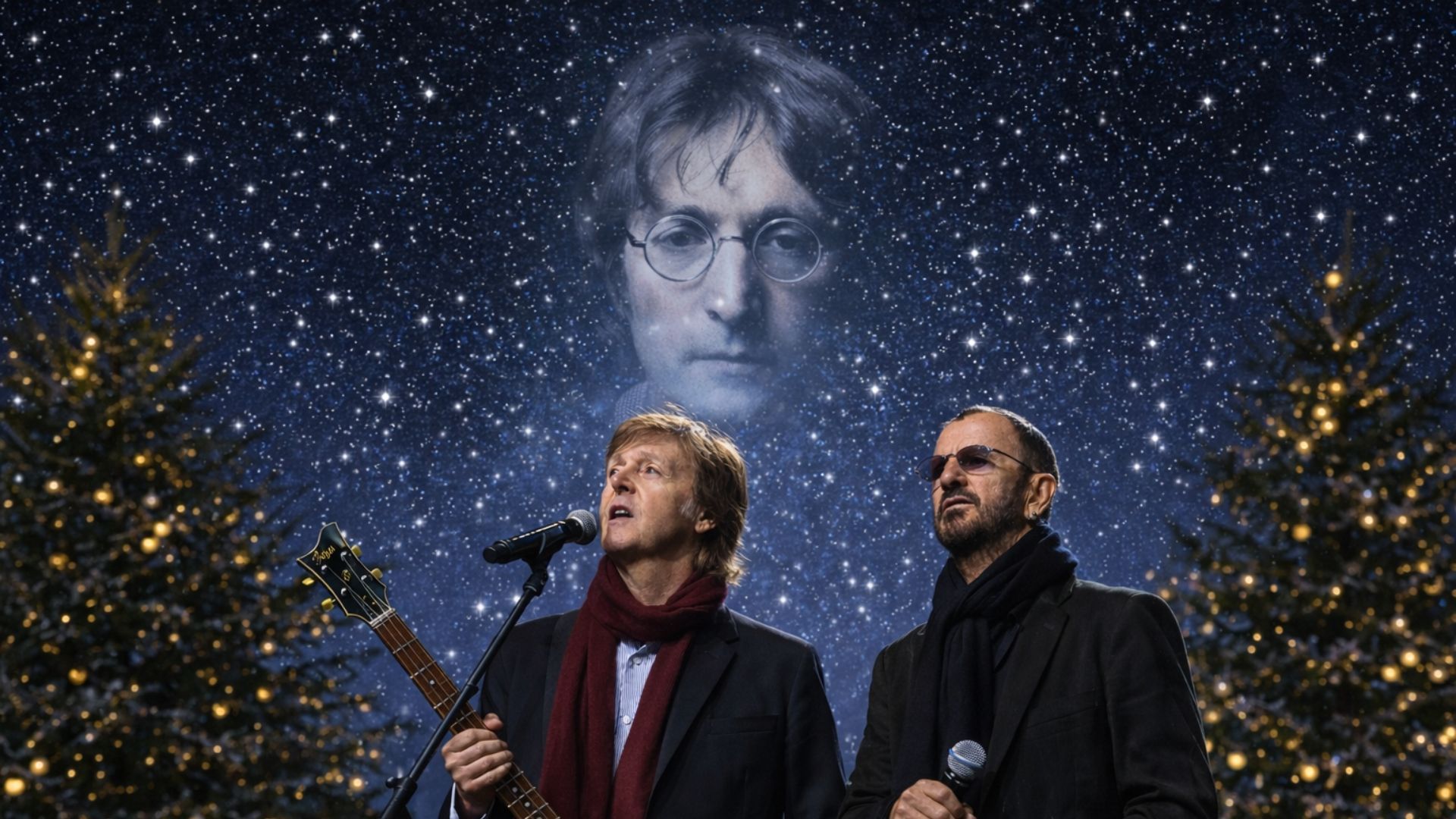 On a Christmas night wrapped in warm light and quiet expectation, a moment unfolded that felt suspended outside ordinary time. Beneath softly glowing decorations, Paul McCartney and Ringo Starr stood side by side and raised their voices together — not as performers chasing applause, but as custodians of memory. What followed was not announced as a reunion, yet it carried the unmistakable weight of one. For many listening, it felt as though John Lennon’s presence had gently stepped back into the room, carried by harmony, memory, and intention.