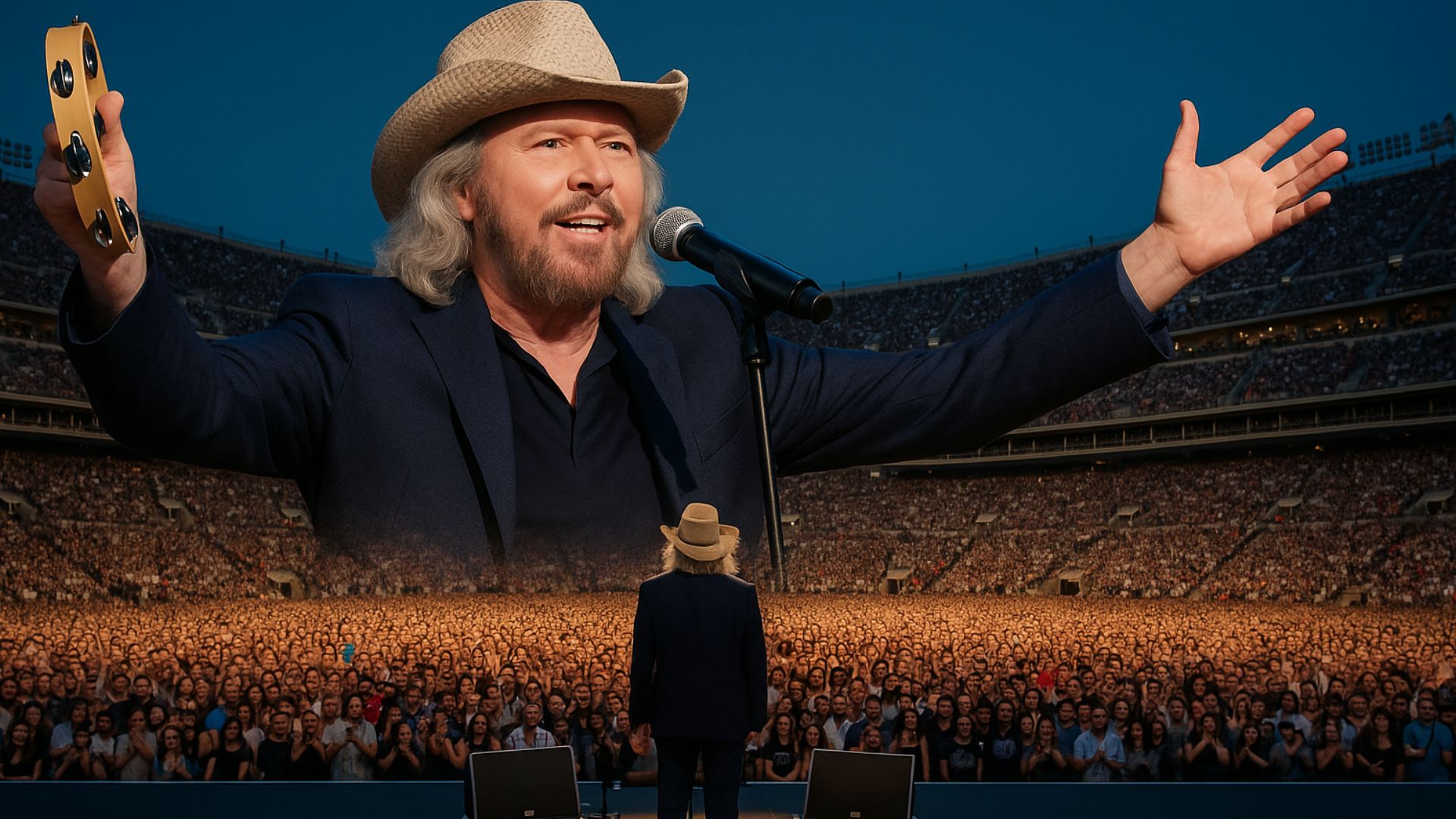 AN UNEXPECTED FAREWELL — No one saw it coming. Under the warm July sky, Barry Gibb stepped into the spotlight, the crowd roaring — until silence fell. Then, with a trembling smile, he announced his 2026 farewell tour… and the world seemed to stop.