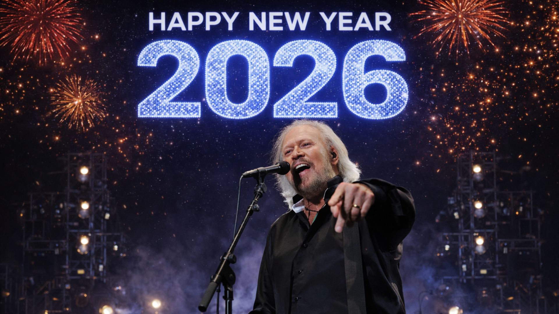 As the final seconds of 2025 slipped quietly toward midnight, the world prepared for noise, color, and celebration. Instead, what unfolded was something far more enduring. Under a sky washed in soft midnight light, Barry Gibb stepped onto the stage and welcomed 2026 not with spectacle, but with meaning.