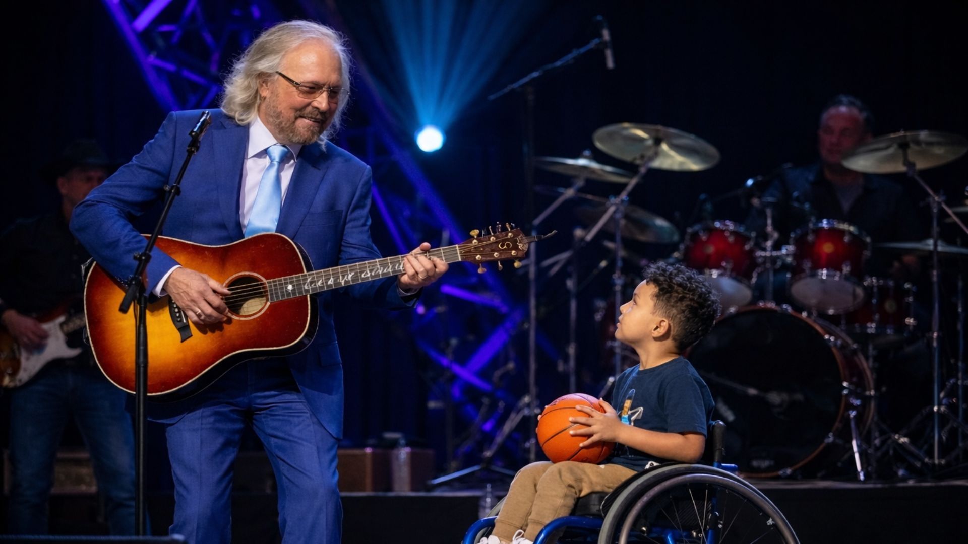 Barry Gibb returned to the center of the stage and placed a gentle hand on the boy’s shoulder. No words were needed. The gesture said everything. It acknowledged courage. It honored the moment. And it affirmed something deeply important: that true legends do not guard the spotlight — they pass it forward.