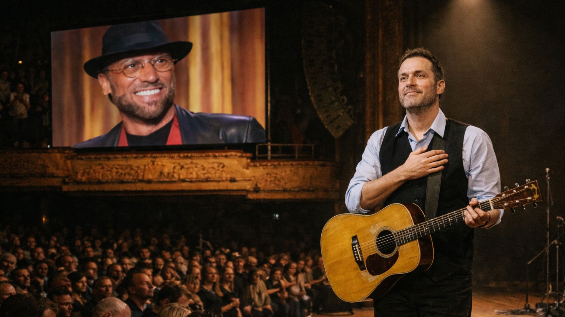 Adam paused at center stage, took a breath that felt longer than it needed to be, and looked out over the audience without saying a word. The spotlight was soft, almost hesitant, as if even the lights understood this was not a moment to overwhelm. Then his fingers found the strings, and the opening chords of a familiar Bee Gees song filled the space — a song forever tied to his father, Maurice Gibb.