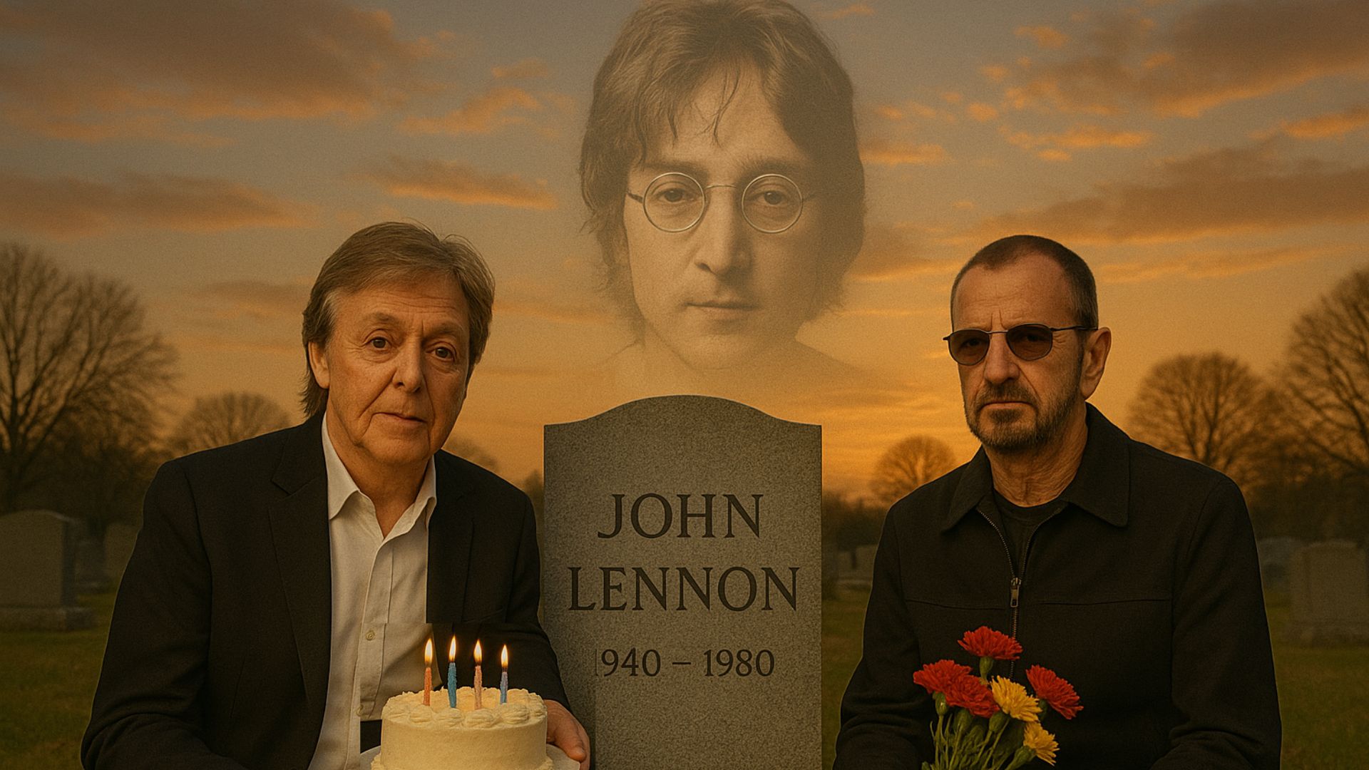 TRUE RESPECT: A Quiet Act That Spoke Louder Than Words No cameras. No reporters. Just silence. Early this morning, Paul McCartney and Ringo Starr, the last surviving Beatles, were seen visiting John Lennon’s grave. In Paul’s hands — a single white flower and a small cake, a tender tribute on what would have been Lennon’s birthday. Witnesses say they stood in silence for minutes, heads bowed, the weight of memory hanging softly in the air.